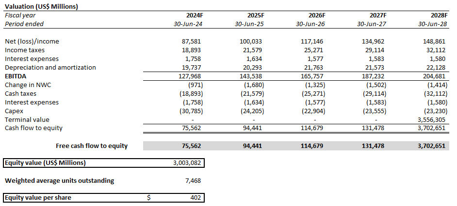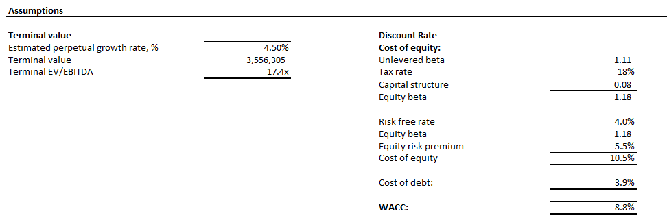 Our price target is derived using the discounted cash flow, or DCF, approach. The analysis considers cash flow projections taken in conjunction with the fundamental forecast discussed in the earlier section. A WACC of 9% is applied to reflect Microsoft’s risk profile and capital structure. Our analysis also assumes an estimated perpetual growth rate of 4.5% for Microsoft. This represents a valuation premium to peers, and exceeds the anticipated pace of longer-term economic growth in Microsoft’s core operating regions.