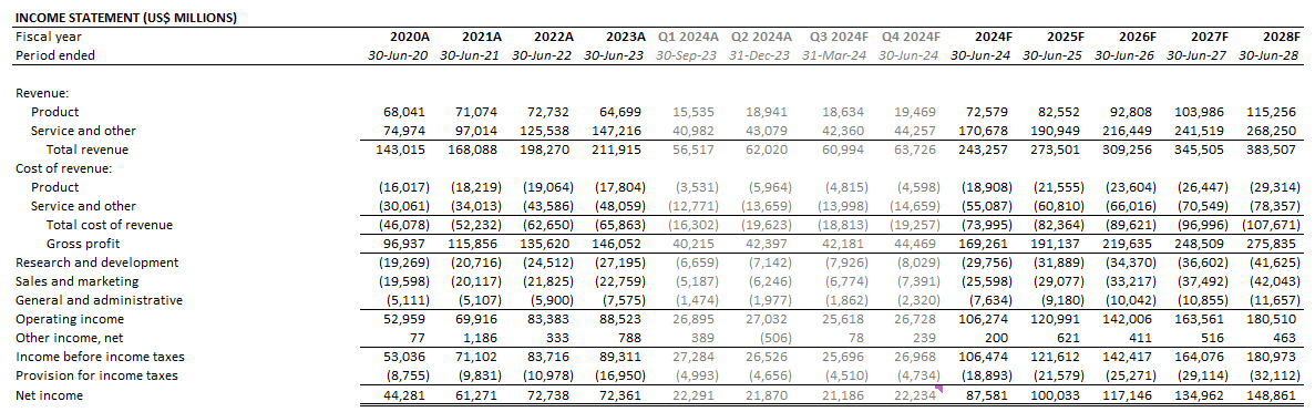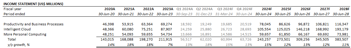 Adjusting our fundamental forecast for Microsoft’s actual fiscal Q2 performance, and the anticipated ramp of AI-related monetization opportunities ahead in its core businesses, we expect total revenue to grow 15% y/y in fiscal 2024 to $243.3 billion.