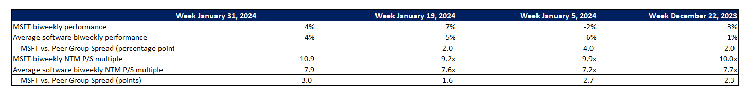 In addition to maintaining its moat across mission-critical technology verticals (e.g., cloud-based productivity software, AI, cloud computing, etc.), Microsoft has also demonstrated strong execution in preserving profitable growth at scale. Looking ahead, we see two themes that Microsoft will likely outperform its peers in capitalizing on in 2024: 1) an improved spending environment on peaked optimization trends in 2023; and 2) the gradual transition from training to inference in generative AI developments.