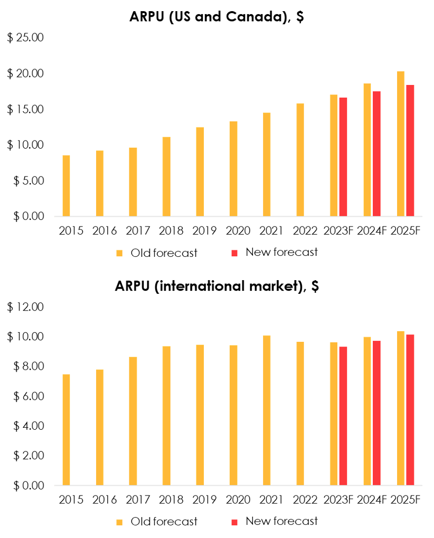 We are lowering the forecast for U.S. ARPU from $17.07 (+7.65% y/y) to $16.63 (+4.84% y/y) for 2023 and from $18.64 (+9.15% y/y) to $17.56 (+5.60% y/y) for 2024. We are lowering the forecast for the ARPU of the international business from $9.64 (-0.24% y/y) to $9.35 (-3.20% y/y) for 2023 and from $10.00 (+3.72% y/y) to $9.73 (+4.07% y/y) for 2024.