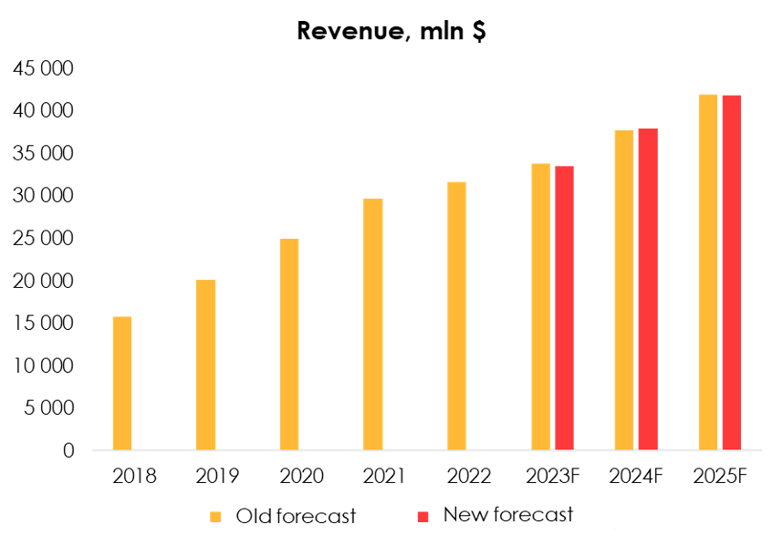 - the reduction of the revenue forecast for 2023 from $33 863 mln (+7.1% y/y) to $33 520 mln (+6.0% y/y) and the increase of the revenue forecast for 2024 from $37 772 mln (+11.5% y/y) to $37 910 mln (+13.1% y/y);