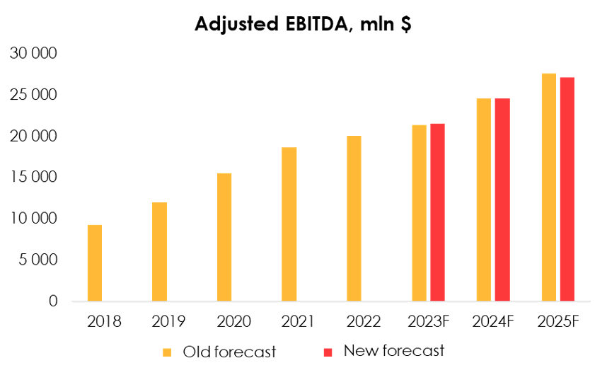 We are raising the forecast for adjusted EBITDA from $21 327 mln (+6.7% y/y) to $21 515 mln (+6.7 % y/y) for 2023 and from $24 527 mln (+15.0% y/y) to $24 563 mln (+14.2% y/y) for 2024 due to: