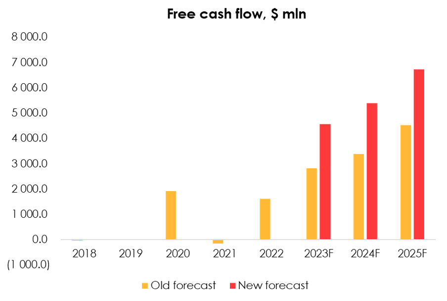 We’re raising the free cash flow forecast from $2 822 mln (+74.4% y/y) to $4 566 mln (+182.1% y/y) for 2023 and from $3 382 mln (+19.8% y/y) to $5 389 mln (+18.0% y/y) for 2024.