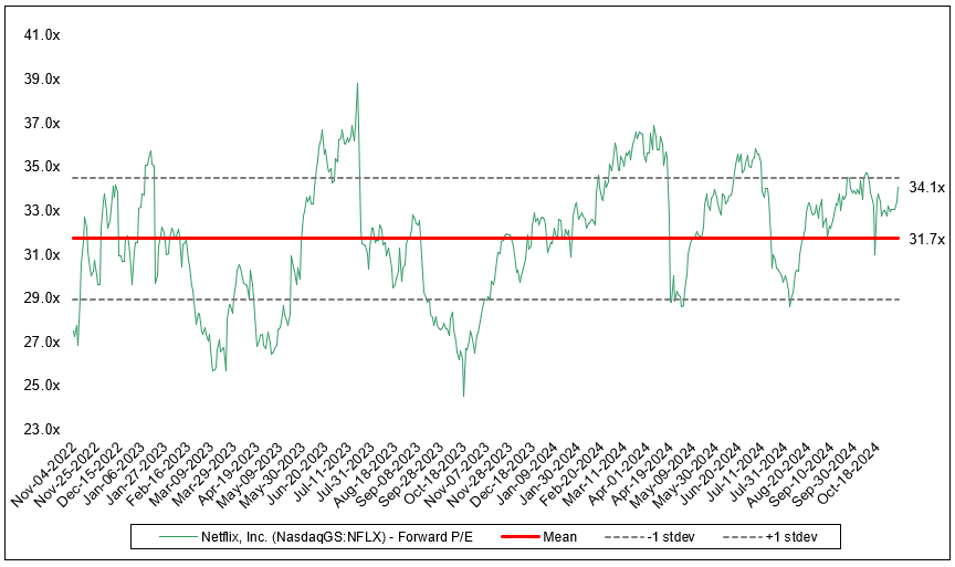 - Netflix’s 3Q24 results exceeded expectations, but the stock’s 66% YTD rise and 34x 2025E P/E suggest limited upside; recommend taking profits.