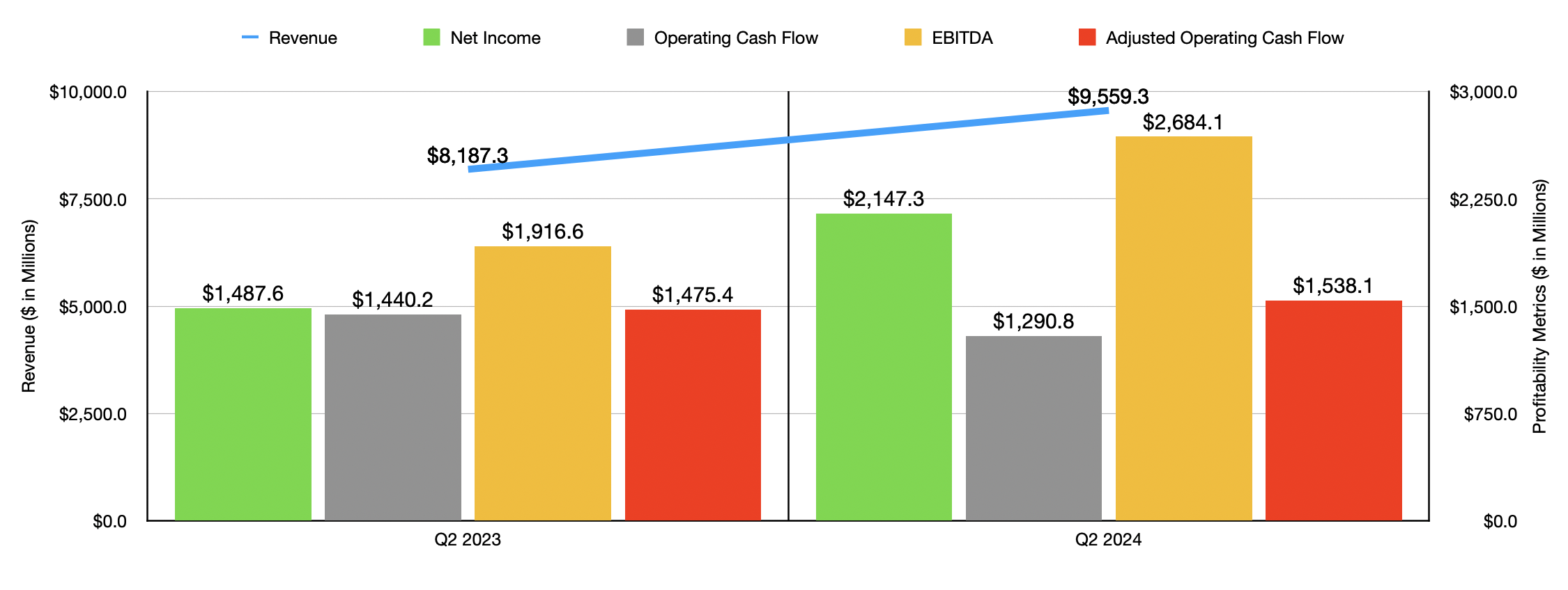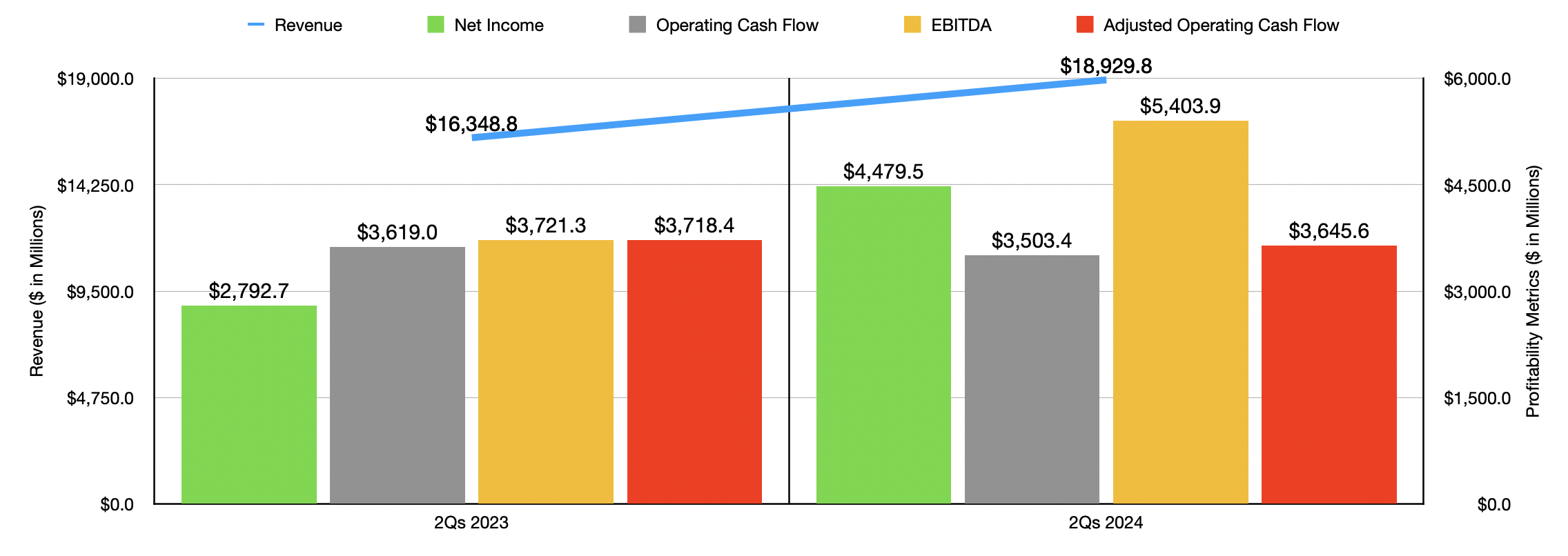 Management does not offer much in the way of guidance. But they did say that, on a constant currency basis, they expect revenue for the third quarter of this year to be roughly 14% higher than it was last year. And for 2024 in its entirety, they said that revenue should now be between 14% and 15% above what it was last year. That’s up from a previous range of between 13% and 15%. We don’t really know what to expect for the bottom line for the year. But if we simply annualize the results seen so far, it would translate to net income of $8.67 billion, adjusted operating cash flow of $7.25 billion, and EBITDA of $10.62 billion.