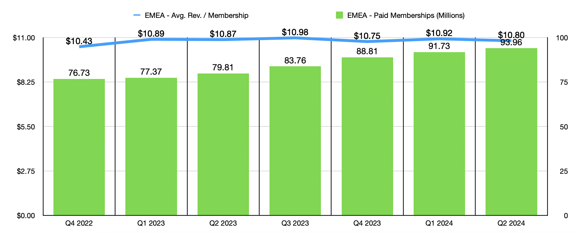 This has not been the only source of growth for the firm. In fact, it has seen membership growth in every single region on a quarter over quarter and year over year basis. In the EMEA (Europe, Middle East, and Africa) regions, membership expanded from 91.73 million in the first quarter of this year to 93.96 million in the second quarter. Year over year, membership is up 17.7%, or 14.15 million. Year over year, average revenue per member did manage to fall from $10.87 to $10.80. This may not seem like much of a decline. But when applied to the number of paid memberships that the company had at the end of the second quarter, this difference would translate to about $78.9 million in reduced revenue on an annualized basis.