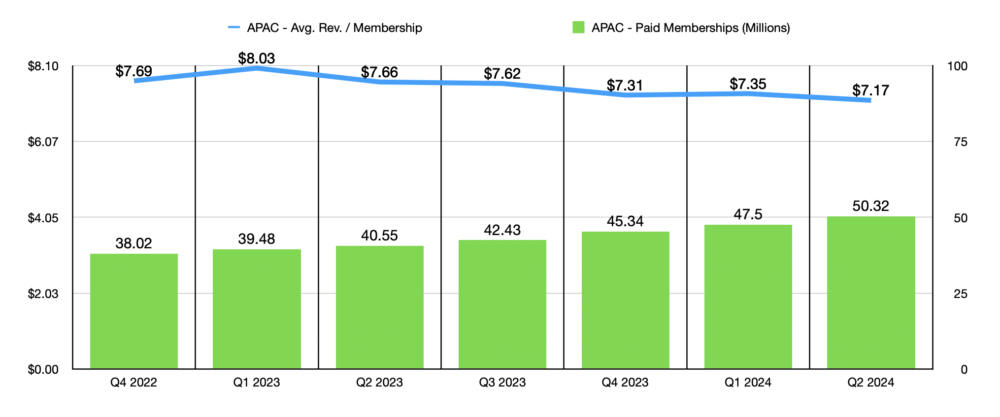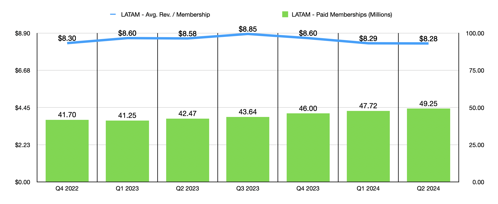 In Latin America, the 49.25 million members that the company had was comfortably above the 42.47 million reported one year ago. But as was the case in the EMEA markets, average revenue per membership did fall, dropping from $8.58 per member per month to $8.28. As disappointing as this is, this drop was actually driven by foreign currency fluctuations. If we use a constant currency framework instead, we would actually get year over year growth in average revenue per membership per month of 24%.