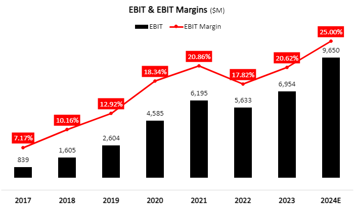 Importantly, Netflix’s cash flow in 2024 is weighed down as a result of production delays caused by the strike. I expect it will surpass $9.5 billion in free cash flow next year, which would put it at around 25x free cash flow.