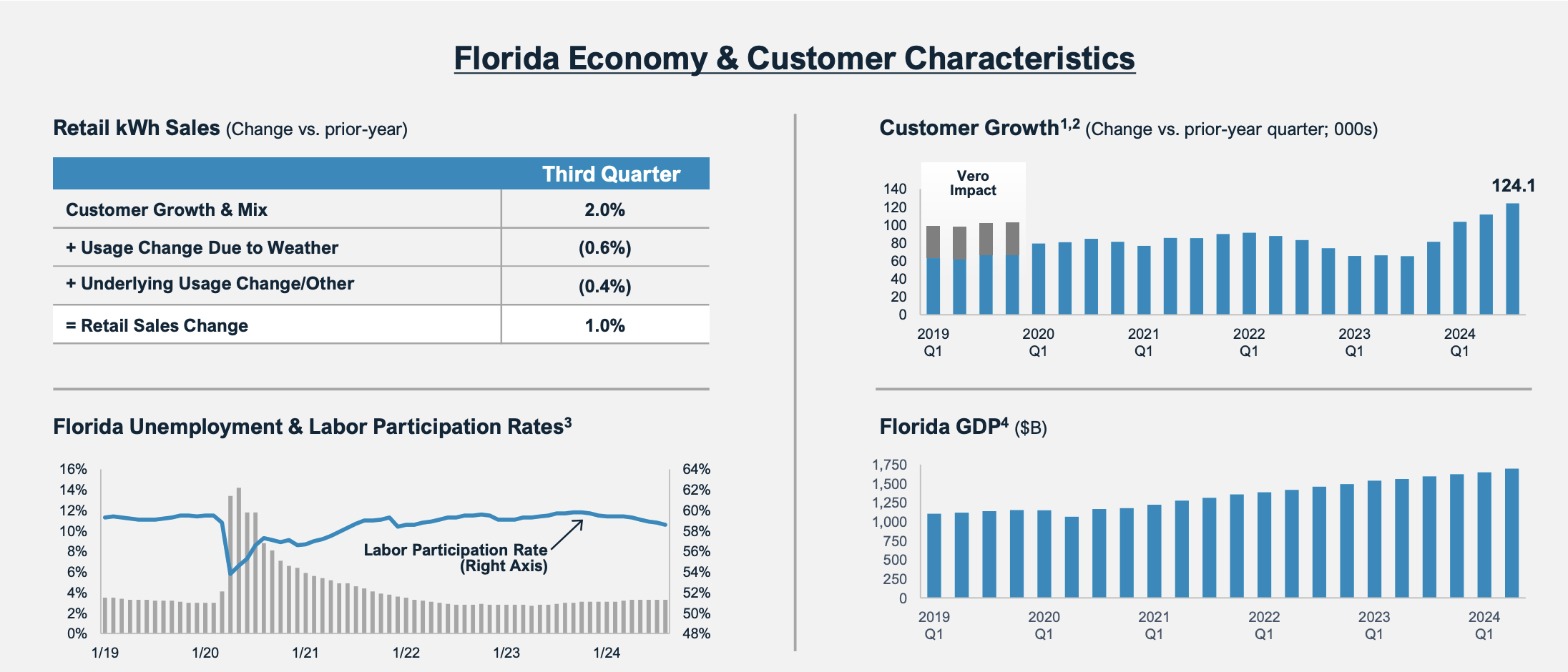 Much of the demand growth is expected to come from datacenters, which are positioned in the northeast. That’s not surprising, a substantial portion of the cost of datacenters is cooling, if you put it in a state that averages 30 degrees lower, that’s massive electrical savings. The company, in its Florida market, has seen ~1% change in retail sales.