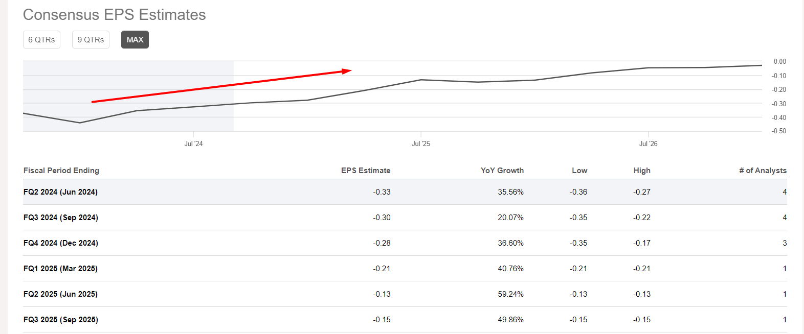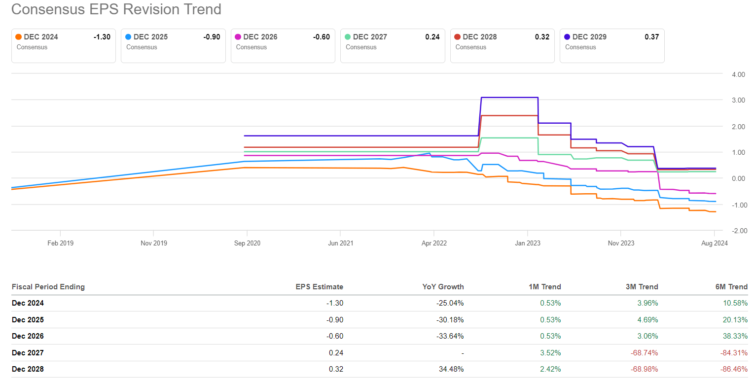 Despite these risks and falling deliveries numbers, Wall Street has become more positive on the prospective EPS figures over the past month. In addition, EPS expectations for the next 3 years have risen significantly over the last six months, although the consensus still expects heavy losses over the 2024-2026 period.