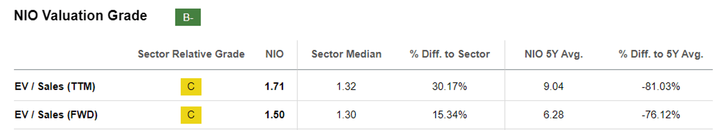 While NIO may appear to be trading at a premium compared to its Chinese automotive peers, such as XPeng (XPEV) at FWD EV/ Sales valuation of 1.76x, BYD Company (OTCPK:BYDDF) at 1.11x, Li Auto (LI) at 0.84x, and the sector median of 1.30x, we believe that the former remains attractive upon a moderate retracement.