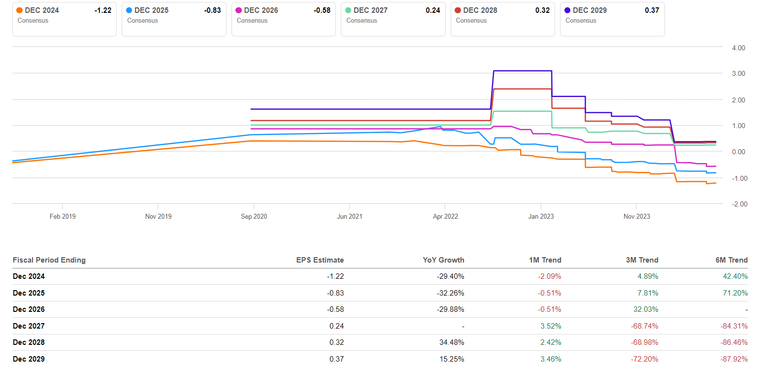 Based on the above, I believe that NIO stock is, so to speak, unfairly lagging behind the new bullish sentiment in the EV space, which was recently triggered by Tesla, Inc. (TSLA), as the positives in this growth story outweigh the negatives. In any case, the company’s risk profile seems to me to have improved, but Wall Street seems to ignore it, keeping downgrading the EPS improvement prospects: