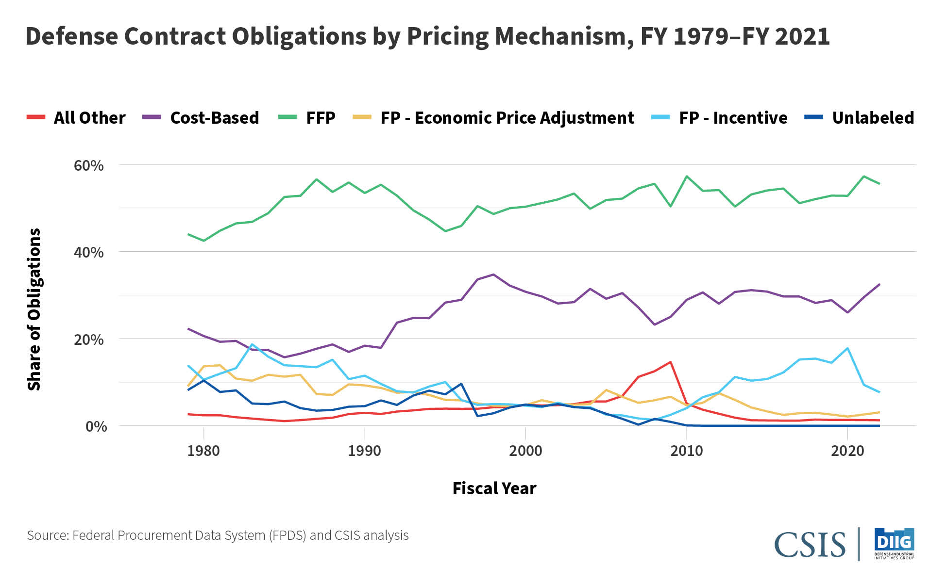 An analysis by CSIS on +4 decades of defense contracts shows how defense contractors are at most risk in the post-pandemic world of inflation and supply chain issues because most of the contracts issued before the pandemic by the U.S. government were some variation of fixed-price contracts, as can be seen in the chart below.