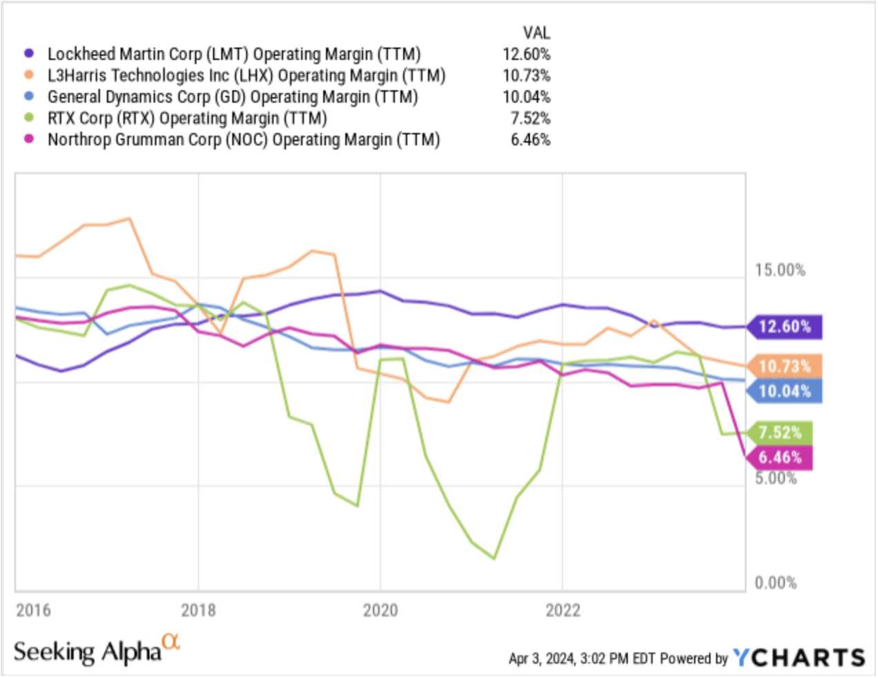 This affects defense contractors that have seen their margins dwindle over the past decade, per my observation. I have added a chart below that shows the margins of the Big 5 in defense.