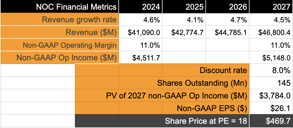 Also, the U.S. government released their FY25 Budget Request last month (page 2-7), which shows reduced/unchanged budgets for many programs in which Northrop participates in such as the B-21, Sentinel Intercontinental Ballistic Missile, and the F-35 programs. This may impact future backlog prospects for Northrop Grumman.