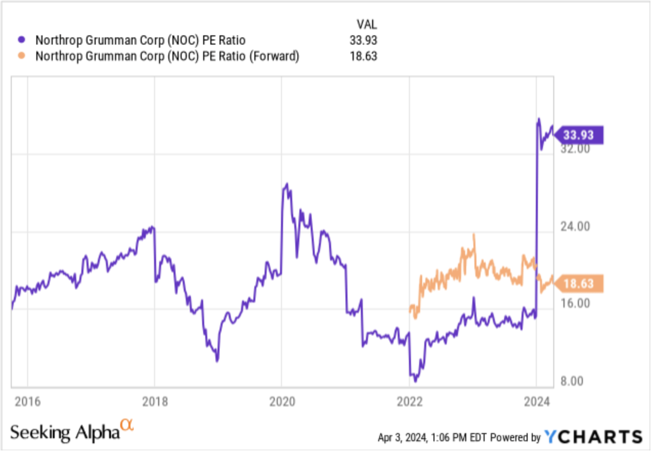 Northrop Grumman’s forward earnings multiple vs trailing PE (yCharts)