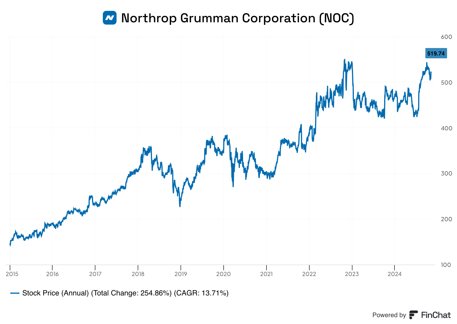 As previously mentioned, Northrop Grumman has a very healthy long-term CAGR of 15.5%. Over the past decade, the stock has performed slightly below that, returning a little more than 250% or a respectable 13.71% annually. In late 2022, the stock reached an all-time high near $556/share before dropping rapidly in early 2023 by nearly 20%. Following that decline, the stock fluctuated between approximately $430 and $490 per share, until August of this year when it surpassed $500 again for the first time since 2022. Over the past year, NOC has risen about 11% and currently sits at $520 a share. Although the stock is lagging the market over the past year, we will examine where the stock may go later in this article.