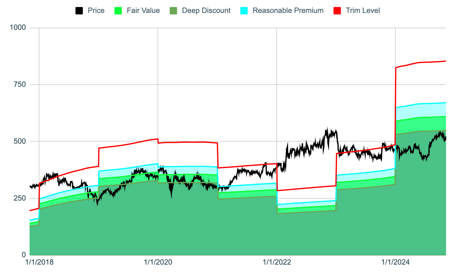 The custom valuation tool suggests Northrop Grumman is trading at an approximate 14% discount to its fair value. After the company’s free cash flow surged in 2018 and 2019 by 53% and 20% respectively, the company saw multiple years of declines from 2020 through 2022. In 2023, NOC saw a robust increase in FCF of nearly 50% and thus far in 2024 FCF sits at $23.51/share, and it appears the stock price hasn’t quite caught up yet.