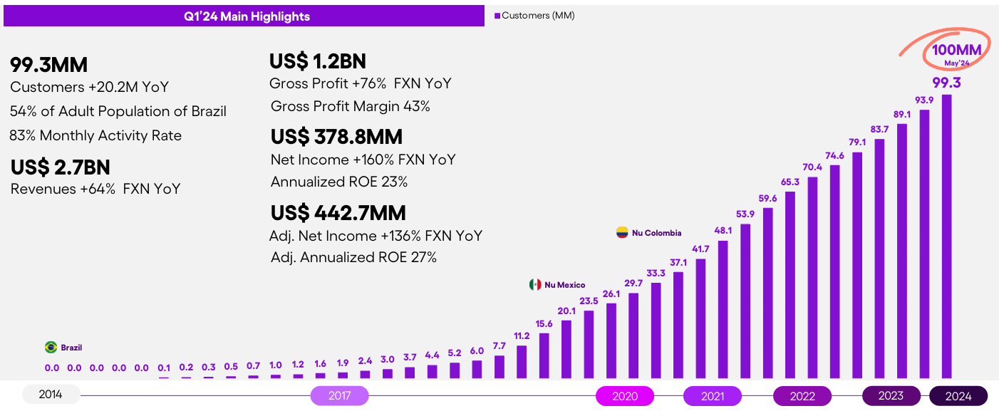 - Nu is a neobank with a strong presence in Latin American countries, showing 105% annual growth between 2020-2023.