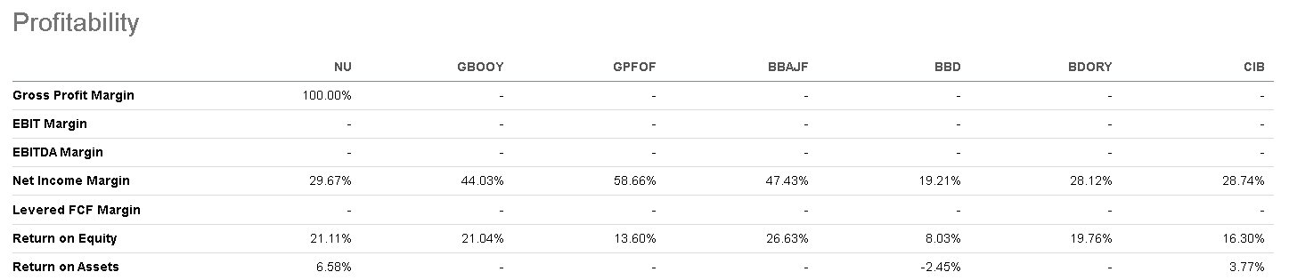 In this matter, it stands out that Nu has not only grown much more than other large banks, but it has done so much more profitably. The net profit margin is around 30% and the ROE is above 21%. I think these figures are sustainable (and even improvable) and partly have to do with the country context, since other banks in Mexico, Brazil and Colombia also have similar ratios.