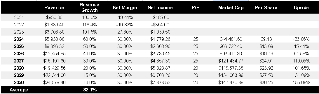 So, I’m going to assume that this year they grow 60% and each year the growth slows down in such a way that by 2030 the average annual growth would be 32% and in the years of lower growth the P/E multiple that I will be willing to pay It would be around 20 times. Still, his would represent a 100% upside between now and 2027.