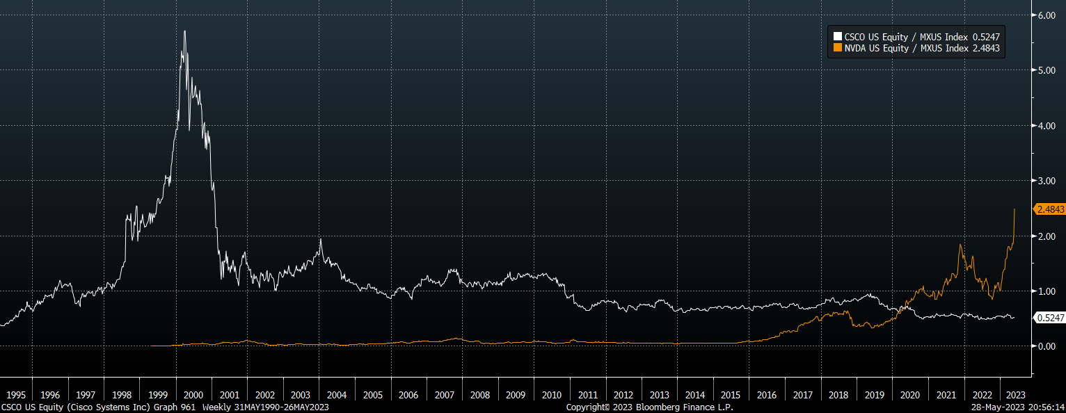 CSCO and NVDA Market Cap, % of MSCI USA (Bloomberg)