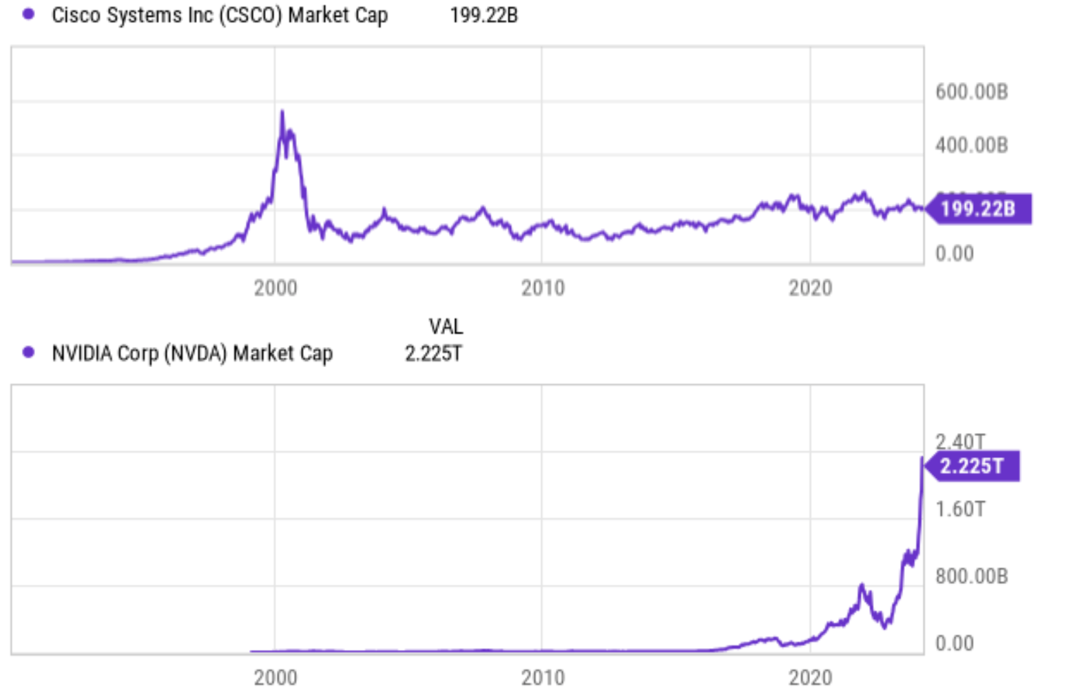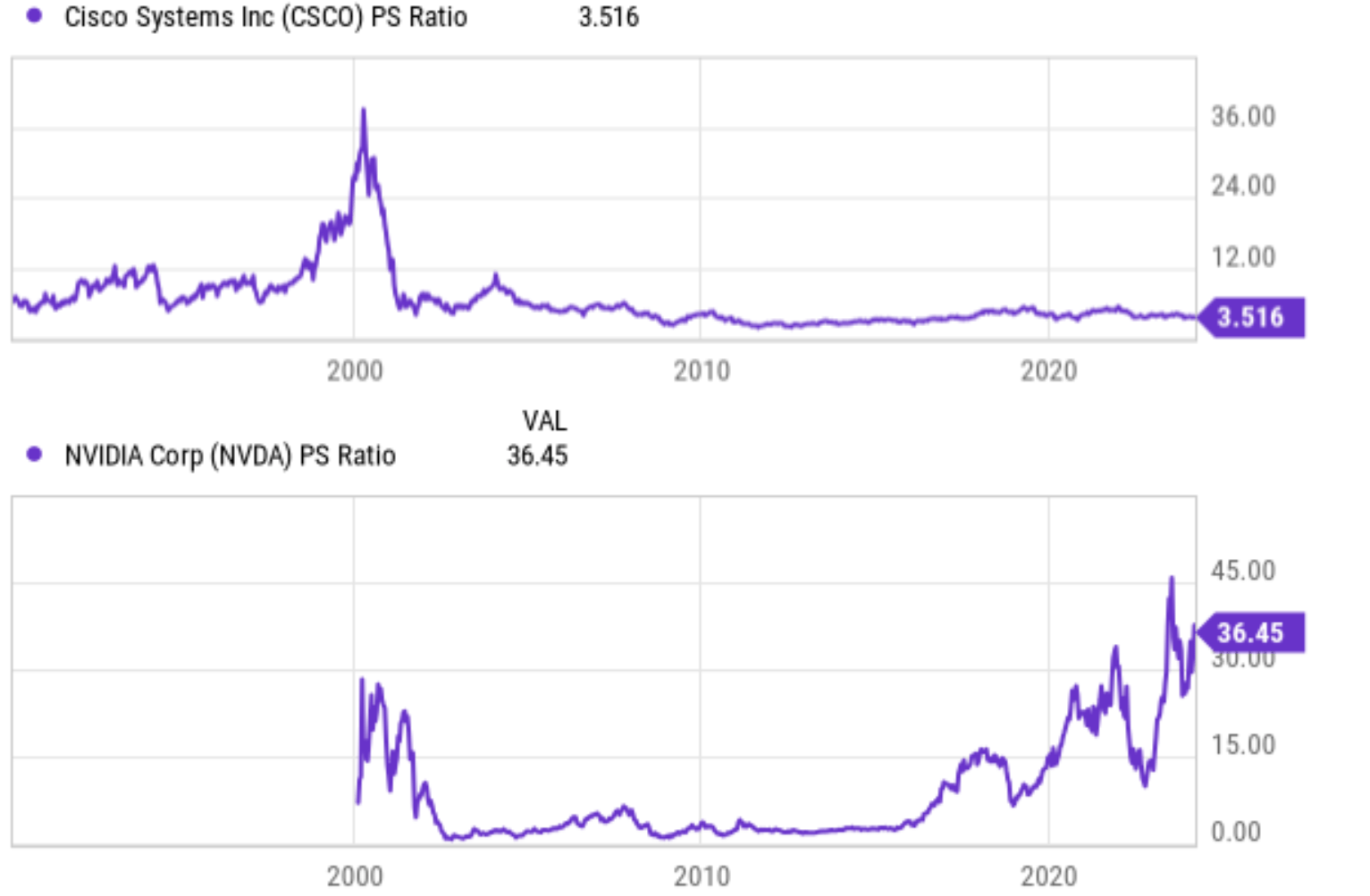 Beyond the similar valuation multiples, the similarities between today’s NVDA and Cisco in the 2000s go deeper. Both were riding a major technological wave. Both NVDA and Cisco were at the forefront of major technological shifts and were viewed as the shovel provider amid a gold rush. Cisco’s dominance came during the dot-com boom when the internet was rapidly expanding, and their routers and switches were essential infrastructure. Today, Nvidia is a leader in the AI revolution, with its GPUs powering advancements in various fields. This association with a hot trend fueled investor excitement and drove up their valuations to bubble regimes.