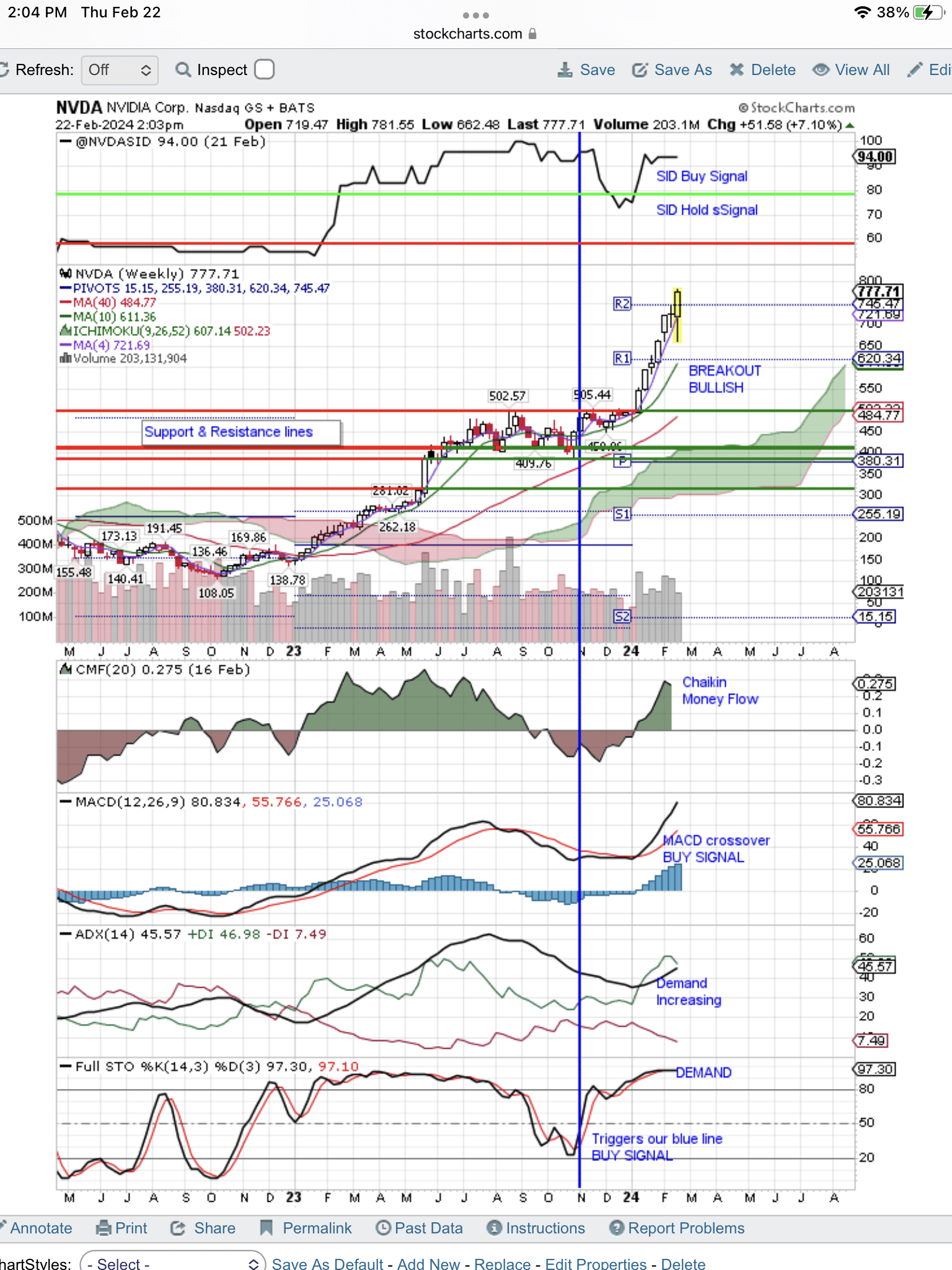 Nvidia Corporation (NASDAQ:NVDA) is in our 2024MP Model Portfolio. We thought about selling before Q4 earnings were released, but here is why we did not. First and foremost, NVDA had our SID proprietary Buy Signal. It was not just a Buy Signal, but a very strong one at 94 out of 100 where 80 and above is a Buy Signal. You can see this signal at the top of the weekly chart shown below and in our daily Model Portfolio report.