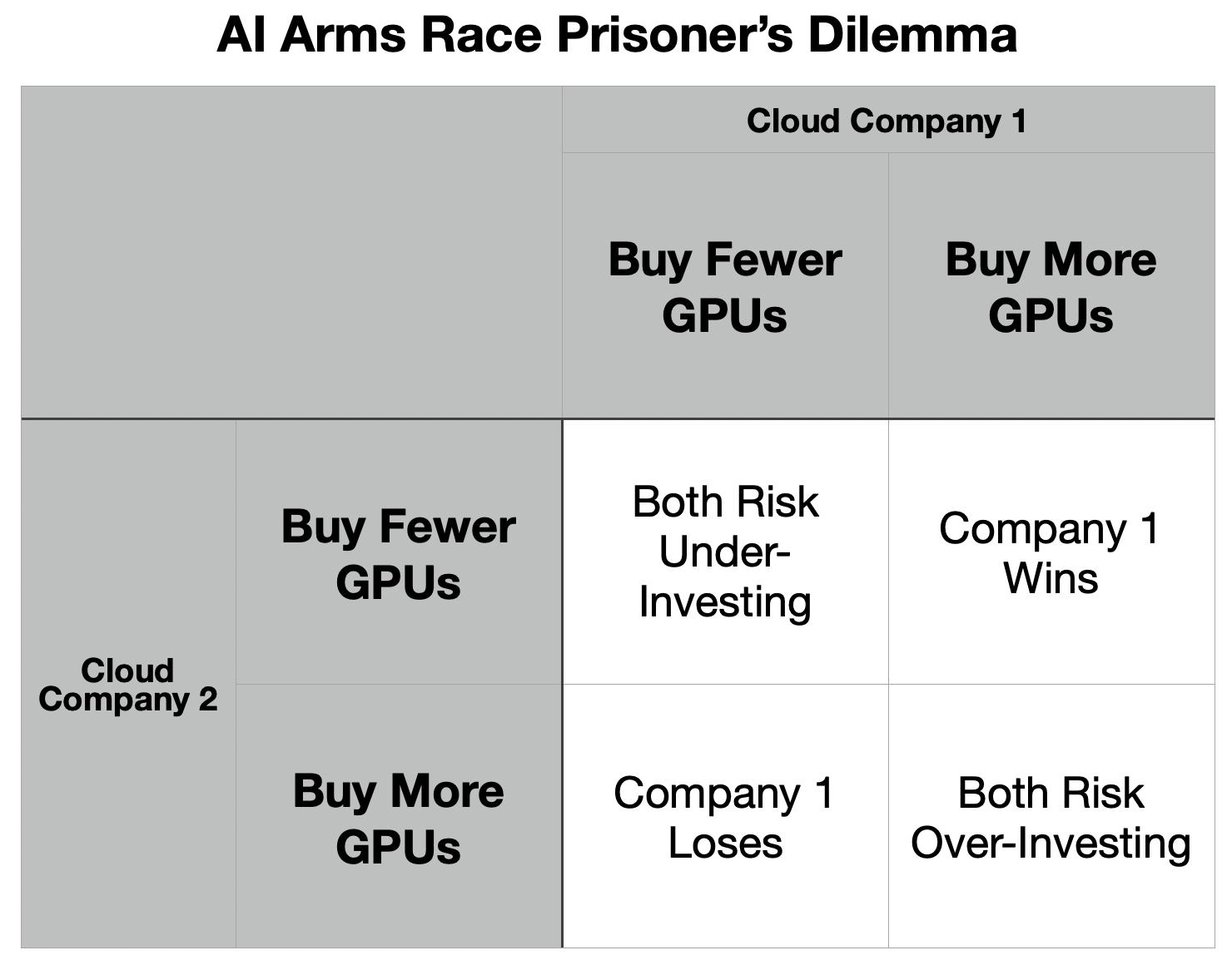 - Top-left. Both companies risk under-investing. GPU cloud compute becomes scarce, and cloud companies can raise prices and margins. Saves CapEx.