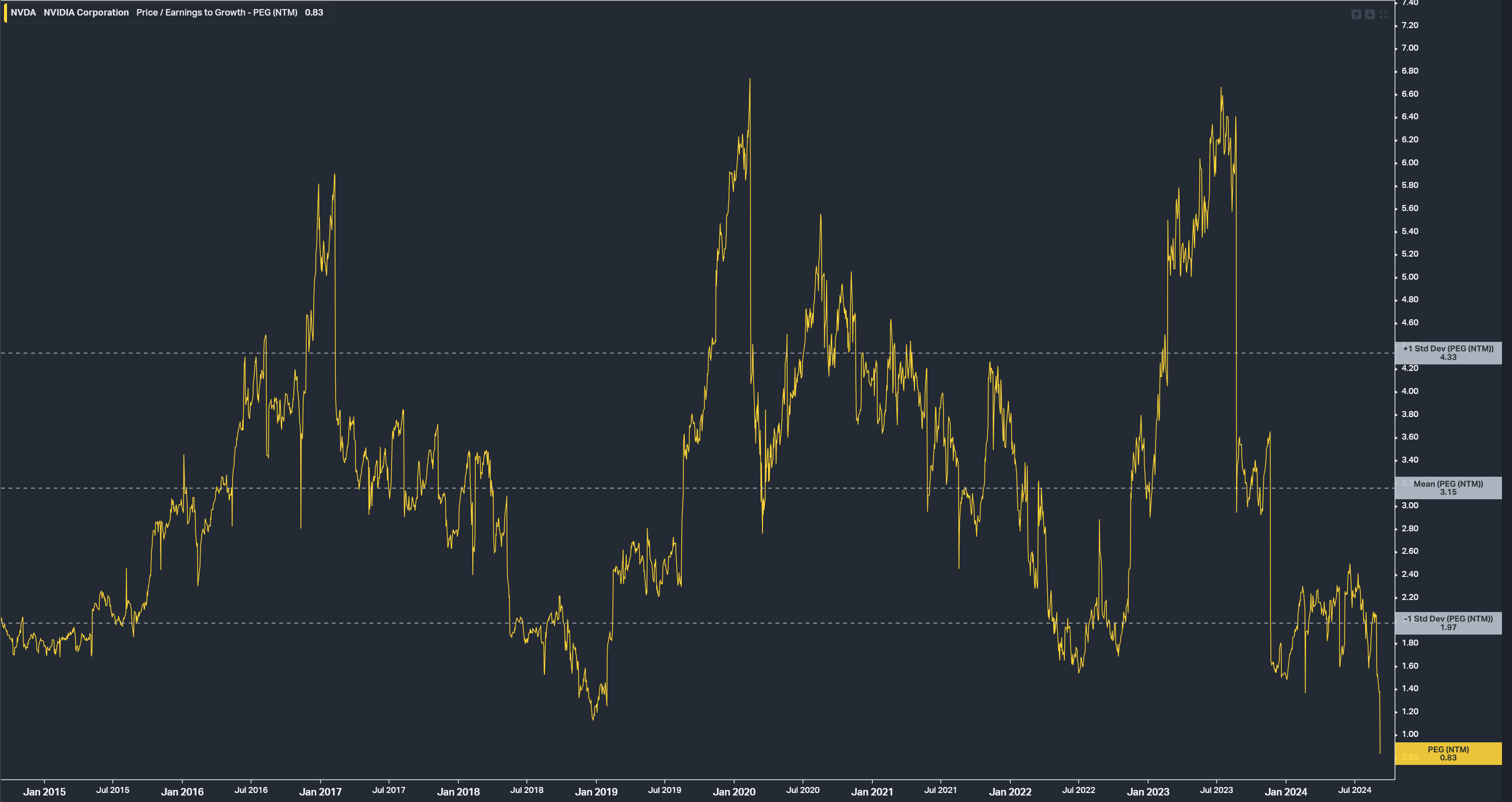 Following a shift in sentiment in markets and a negative response to the firm’s recent earnings, shares are now trading at the most attractive level relative to growth in a decade. Investors need to be realistic about what time of return they might achieve, given the stock has grown into a $2.5 trillion behemoth. Expecting a repeat of the 700% since over the last two years is not realistic, but based on my own DCF analysis, I believe the stock is set up to deliver mid-teens returns for investors.