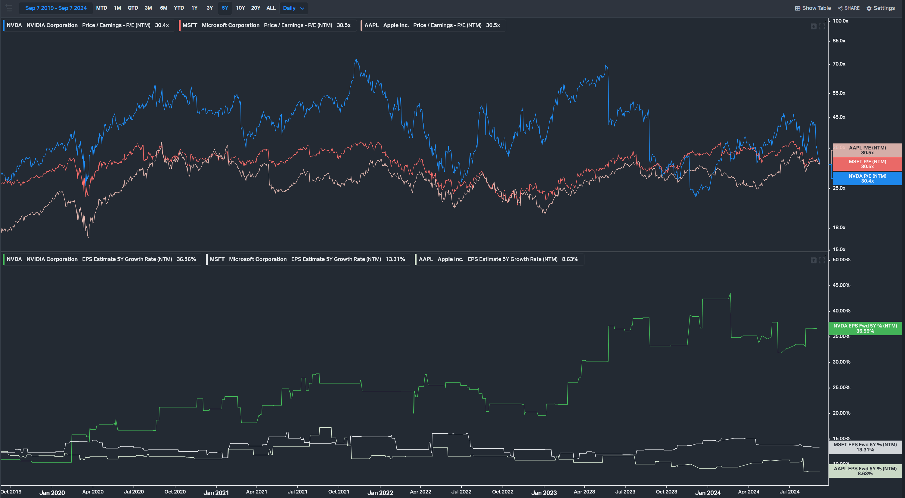 However, as earnings have continued to grow substantially as noted above and the stock price has come back down to earth, the valuation multiple once again looks reasonable. Nvidia is trading on a 30x P/E which is in-line with Big Tech peers Microsoft and Apple (AAPL). However, despite an equivalent P/E multiple, Nvidia is forecast to grow substantially more in the medium term, with an EPS forecast nearly 3x Microsoft’s and over 4x Apple’s.