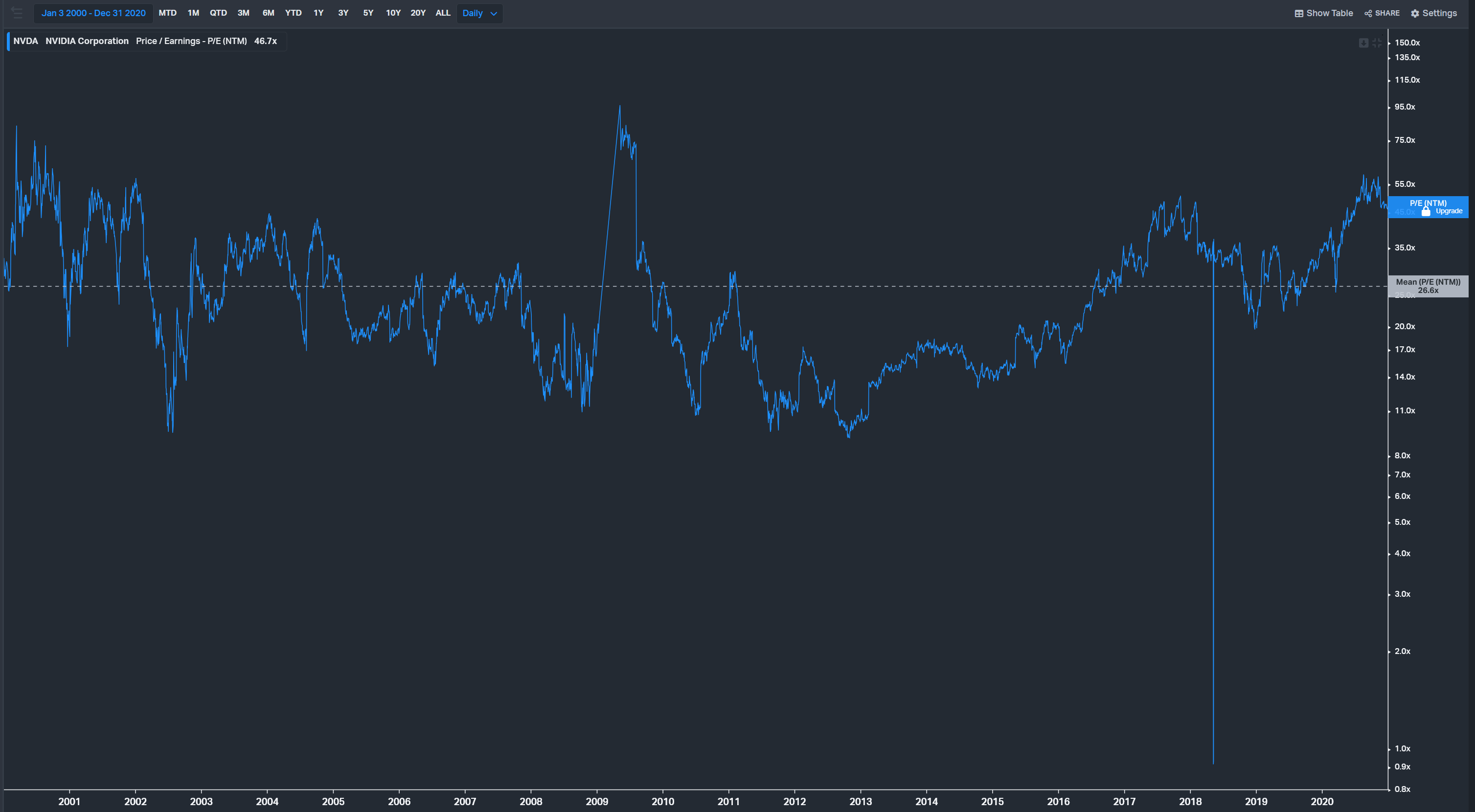 For me, valuation has consistently been a hurdle to finding a good entry point for Nvidia stock. Recently, the stock has consistently traded at or above a 40-50x forward P/E, this contrasts to a twenty-year average P/E from 2000 to 2020 of closer to 26x.