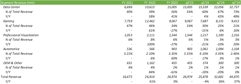 NVIDIA Corporation’s (NASDAQ:NVDA) revenue in fiscal Q3 ’24 went into hyperdrive as the data center grew a massive 48% Y/Y on a TTM basis, with gaming and professional visualization returning to high-growth rates of 16% and 20%, respectively. It is clear the renaissance