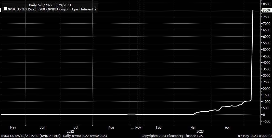 An options trader is betting that the market returns to its sense on Nvidia over the next few months. On May 9, there was a notable increase in open interest for Nvidia’s September 15 $280 puts, with around 6,900 contracts bought on the ask for approximately $26.50 to $26.60 per contract. This implies that the trader would require the stock to drop to roughly $253.50 to earn a profit if holding the put contracts until expiration, a decline of approximately 13.0%. This is a substantial bet, with the trader paying a roughly $18 million premium.