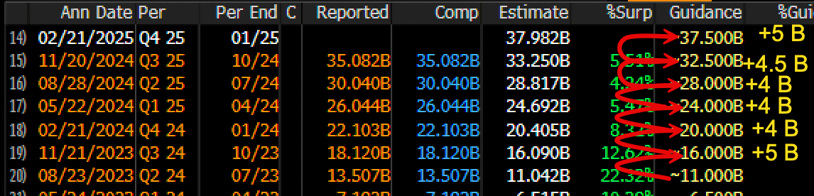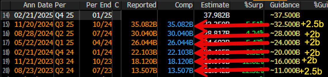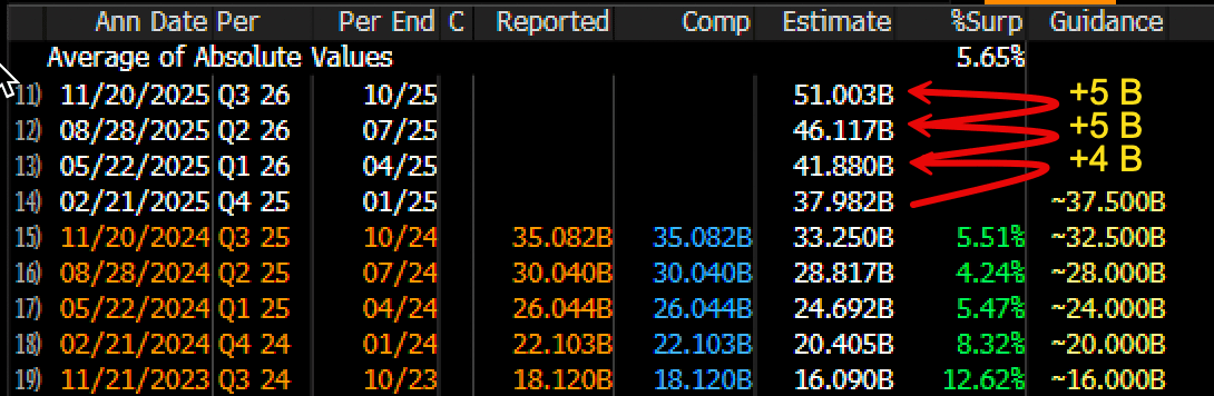The other problem is that the company has lost its ability to surprise the market. As noted previously, simply following the pattern of beating by $2 to $2.5 billion and raising by $2 to $2.5 billion made it reasonably easy to predict that the company would report revenue around the $35 billion range and guide to around $37 billion.