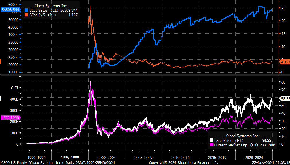 Ironically, Cisco (CSCO) saw something similar. In the late 1990s, analysts projected huge sales growth numbers for the business, which resulted in the stock trading at about 25 times its next four quarters’ sales estimates. The company eventually went on to not only reach those lofty expectations but exceed them over time. However, the market never valued the business the same way. As a result, Cisco’s stock still trades for less than the highs seen in the dot-com bubble, and the market cap is half what it was back then.