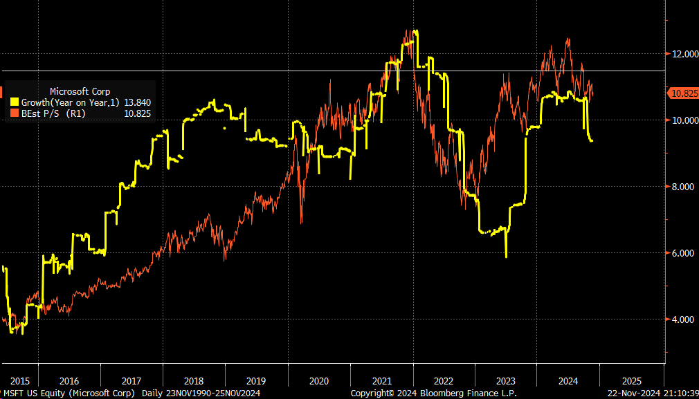 This has been the case in many companies, Microsoft even being one. The stock has struggled recently, and it isn’t because revenue isn’t rising, or the company is performing poorly. Perhaps it is because the revenue growth rate, after accelerating in 2023, is now slowing, and as a result, the price-to-sales ratio is contracting.