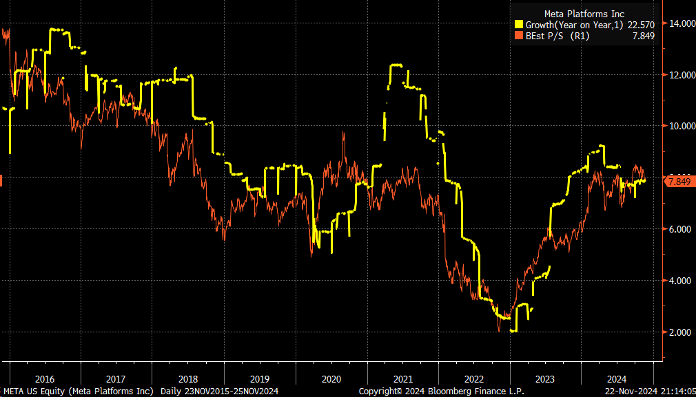The same pattern is present in Meta (META), with the stock’s price-to-sales ratio simply trading with its growth rate. Since November 2022, the stock multiple has expanded rather dramatically, and that was because the company’s revenue growth accelerated. So it should be no surprise that now that stock sales growth has started to slow, the price-to-sales ratio has stopped expanding.