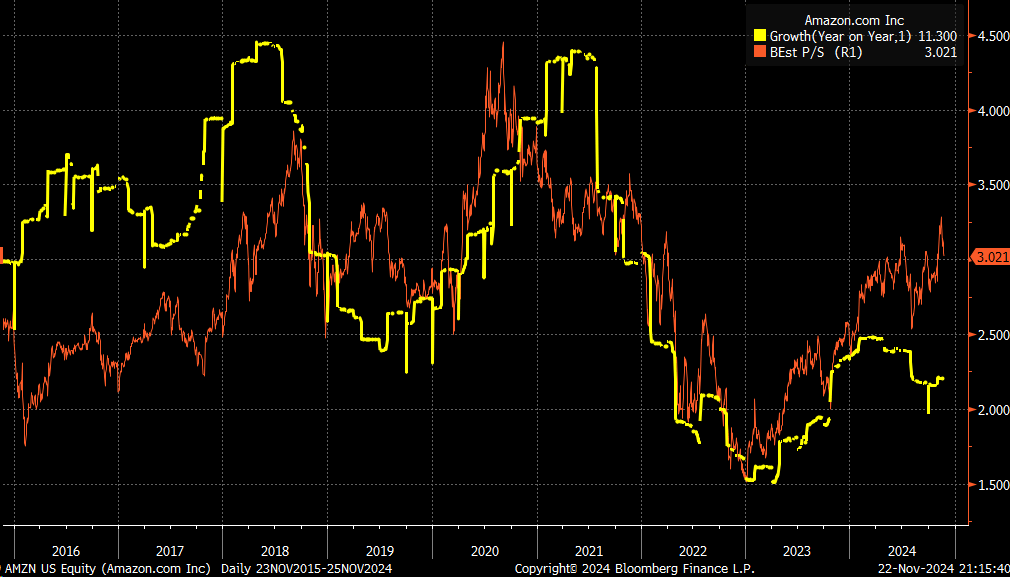 It is the same situation for Amazon as well. Revenue growth slowed drastically starting in 2021 and rebounded in early 2023. As revenue growth began to recover, the sales multiple began to rise. But notice that since sales growth only recovered modestly, the multiple expansion was more modest.