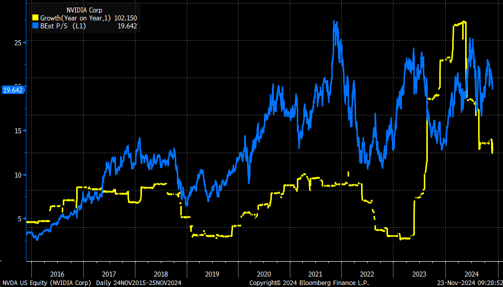 - Nvidia faces two major issues: predictable revenue forecasts and the likelihood of a contracting price-to-sales multiple due to slowing growth.