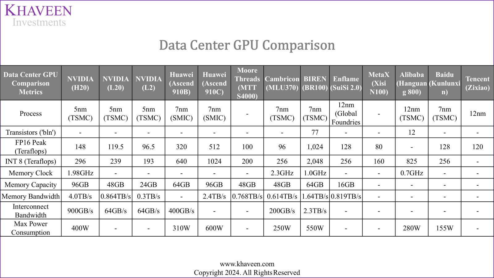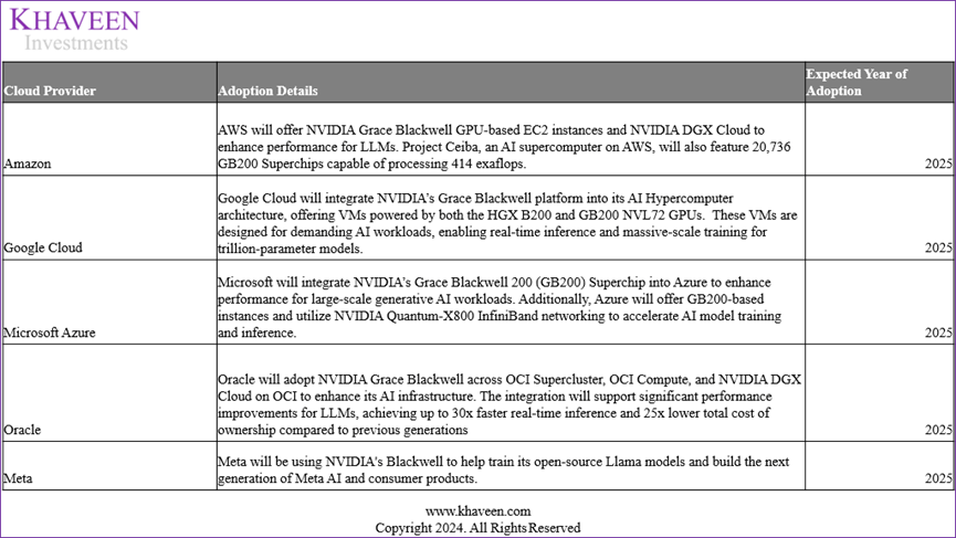 We believe Nvidia stands to benefit from the expansion of data center infrastructure driven by investments from major cloud providers as many of which utilize Nvidia’s chips in their data centers. For instance, Oracle recently announced a new cloud region in Malaysia will leverage “up to 131,072 Nvidia Blackwell GPUs, integrated with Nvidia ConnectX-7 NICs for RoCEv2 networking and Nvidia GB200 NVL72 rack solutions using liquid cooling and Nvidia Quantum-2 InfiniBand networking”. Additionally, Meta’s CEO, indicated that its compute infrastructure would “include 350,000 H100 graphics cards from Nvidia.” Despite Google developing its own custom silicon, CNBC reports that “Google data centers still rely on general-purpose central processing units or CPUs, and Nvidia’s graphics processing units.” AWS has also stated that it will “offer Nvidia’s newest chips on its cloud service.” Furthermore, Microsoft Azure is collaborating closely with Nvidia on the Grace Blackwell 200 Superchip to provide next-generation AI solutions.
