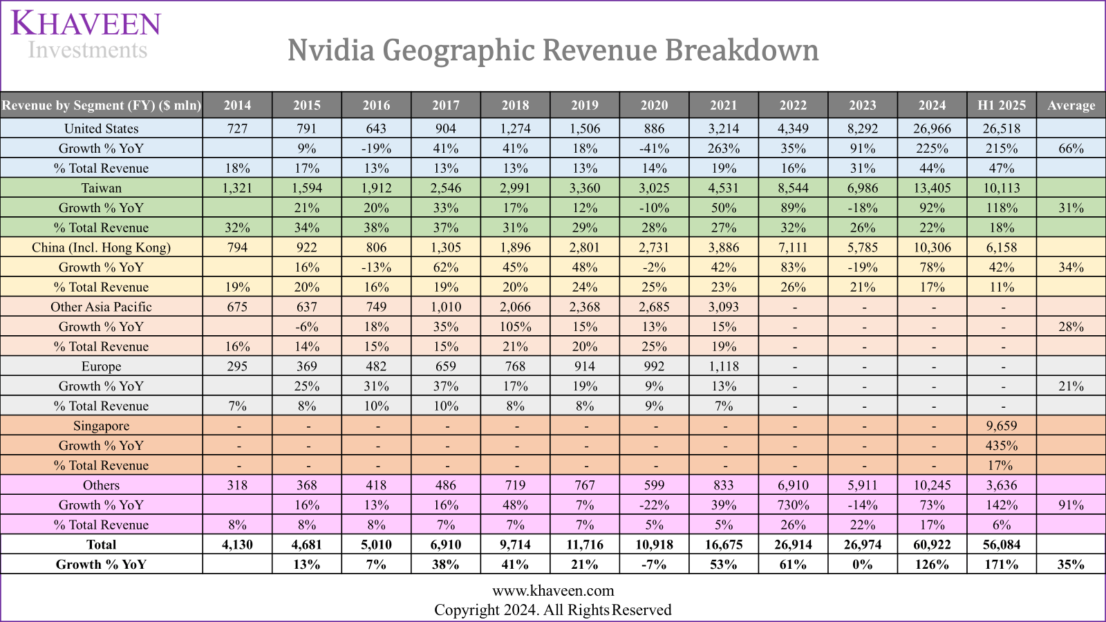 In terms of its geographic revenue breakdown, the US has been the largest geographic region for the company since FY2023 and continued to see explosive growth through H1 2025, with its share of revenue rising from 13.8% in 2020 to 47.3% in H1 2025, driven by sharp increases in 2024 and H1 2025, which “was primarily due to by higher U.S.-based Data Center end demand.” The company’s second-largest geographic region is Taiwan, which represents 18% of revenue in H1 2025. Although its growth had been strong, growing by an average of 31% since 2014, its share of revenues dropped from 32% to 18% in H1 2025 during the same period despite strong growth. China is the fourth-largest geographic region for Nvidia, accounting for 11% of revenues in H1 2025. Despite trade restrictions introduced in 2022 (FY2023), the company’s growth in 2024 and H1 2025 had still been strong but below the company’s total growth. Moreover, its Others segment growth has been particularly strong, growing on average 91% over the last 10 years and accounting for 17% of 2024 revenues.