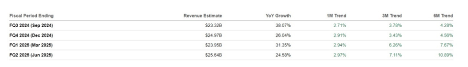 The analyst consensus estimates are trending higher, which typically, you’d see a decline in the analyst estimates on the news of a material delay. Analysts expect Q3 revenue to grow 38.1% YoY to $23.32 billion from the earlier 32.5% growth expected in mid-June and 32.1% growth expected in mid-May.