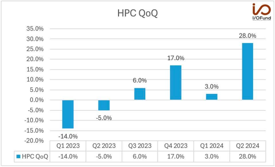 On a QoQ basis, the chipmaker’s high-performance computing (HPC) revenues rose 28% QoQ to $10.8 billion and accounted for 52% of Q2 revenue, up from 46% of revenue in Q1. HPC is above the 50% mark for the first time.