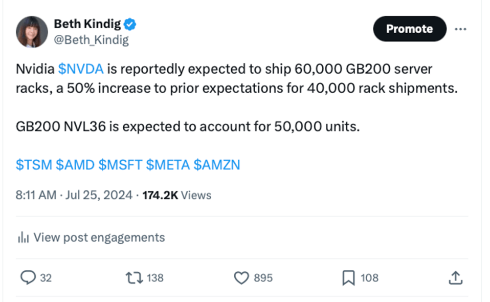 As of now, there’s a disconnect between next fiscal year’s revenue estimates of $167 billion and the $210 billion in GB200s alone expected to ship next year. Perhaps analysts are waiting for signals the supply chain can produce these outsized orders. So far, so good with the signals we see from TSMC and SMCI’s most recent earnings reports. Foxconn commentary helps as well.