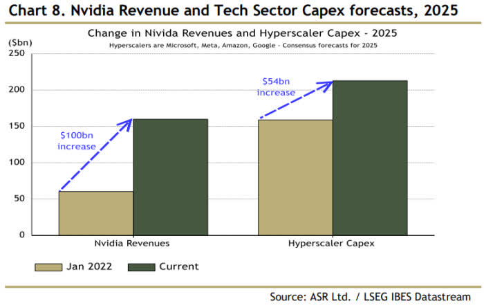 So far, the handful of winners includes Nvidia, semiconductor peers, and the ‘Fab Five’ as we saw – which actually unveils another risk to Nvidia: a large portion of Nvidia’s revenues are expenses for the ‘Fab Five’. 40% of Nvidia’s revenue comes from Microsoft, Meta, Amazon, and Google – each of which have committed billions in capex to build AI infrastructure, but not nearly enough as Nvidia’s revenues are expected to grow: