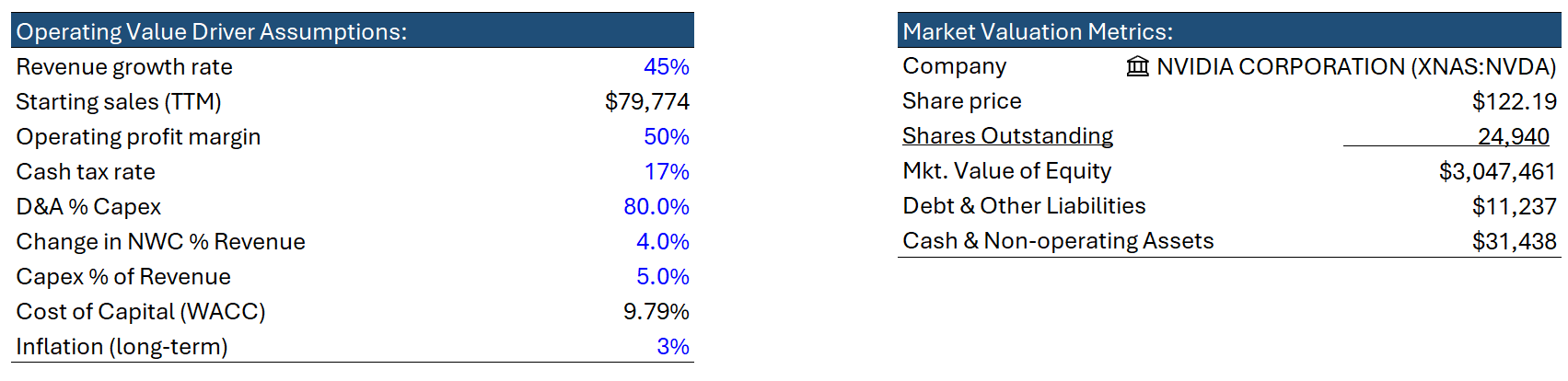 The Expectations Investing framework provides a useful methodology for measuring and judging the market’s implied expectations. Starting with the current stock price and then leveraging a reverse DCF model, we can assess the market’s expectations for Nvidia. Our starting inputs are consensus estimates for revenue growth and operating profit margin. Analysts expect revenue growth near 100% for this FY 2025 tapering down to just under 20% in FY 2027, so I used an average of 45%. Nvidia achieved an operating margin of nearly 60% the past twelve months, but I expect it to normalize around 50%. Other inputs include the cash tax rate, working capital investment, fixed capital investment, depreciation & amortization, and inflation – each of which I estimated using historical averages or most recently reported figures. I calculated the cost of capital using the CAPM model for cost of equity (beta of 1.5, risk free rate of 4%, equity risk premium of 4%), a 2.3% after-tax cost of debt, and Nvidia’s current capital structure. Here are my inputs:
