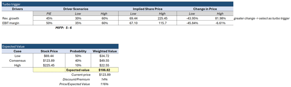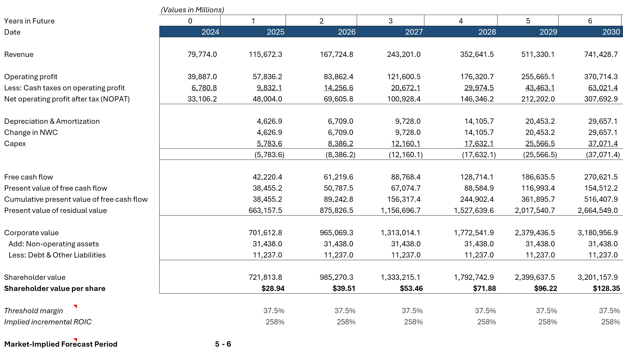 These numbers then flow into a reverse DCF model which calculates the shareholder value per share for each projected year and the market-implied forecast period (‘MIFP’) or the competitive advantage period (‘CAP’). The MIFP or CAP is the number of years the market expects a company to generate returns above the cost of capital, i.e. how long the company will produce the inputted operating value drivers. For Nvidia, the MIFP is between 5 and 6 years.