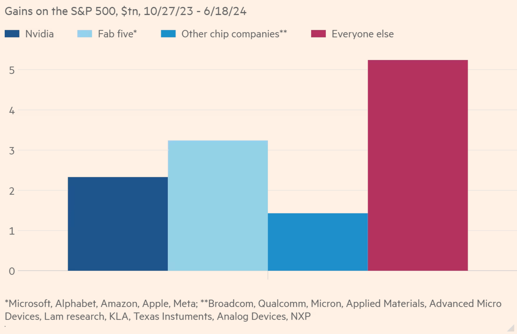 The generative AI (gen-AI) theme has been the backbone of a soaring market that is on pace to match its incredible performance in 2023, currently up 15% year-to-date (S&P 500). Despite many companies doing well the past two years, much of the market’s strength is in just a handful of mega-cap tech companies leading the AI race. Since the short-lived dip in October of 2023, over 50% of the S&P 500’s gains are attributable to Nvidia, other semiconductor companies, and the ‘Fab Five’.