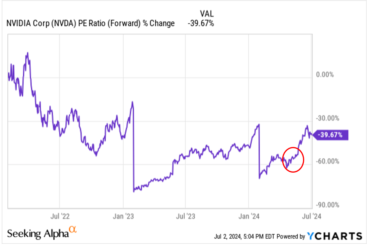 As we’ve seen, Nvidia’s stock price has been a magnet to underlying fundamentals, but this may be beginning to change. Revenue and earnings growth estimates for Nvidia look to be normalizing with analysts expecting growth between 20% and 30% by FY 2026 – quite moderate given its recent numbers. As a result, Nvidia’s forward PE ratio has jumped 50% since March, indicating valuation has recently been more influenced by multiple expansion rather than forward growth and fundamentals.